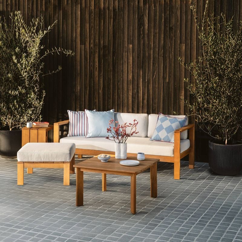 The ottoman made from FSC-certified wood, adds natural warmth and elegance outdoors. With a water-resistant cushion and anti-slip velcro, it offers comfort and stability - perfect as a footrest or extra seating.