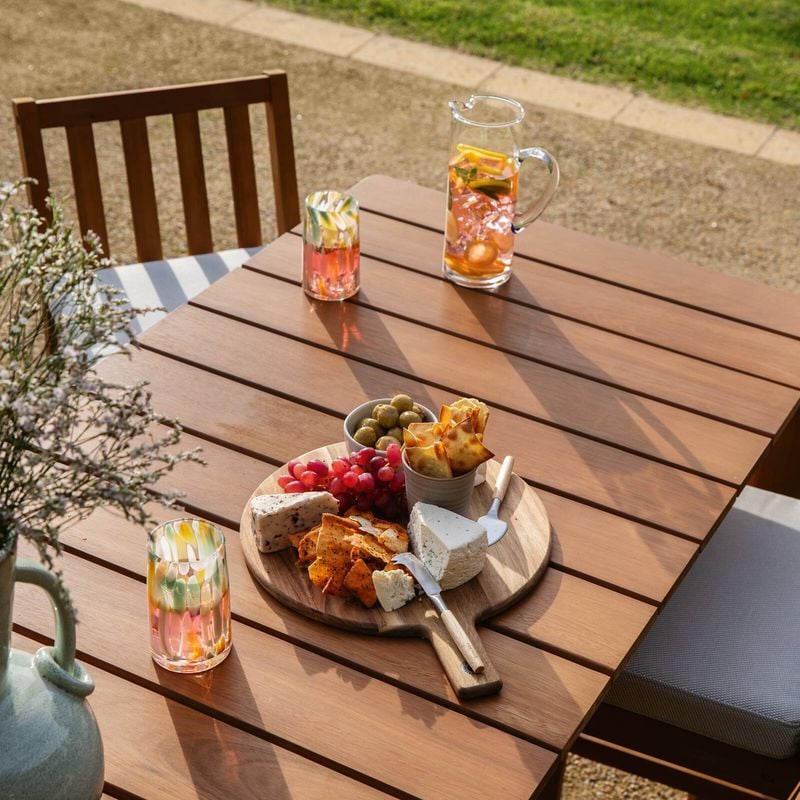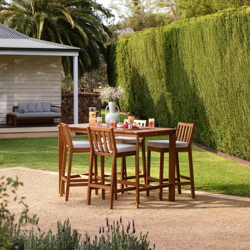 The bar table is a perfect solution for a sturdy, stylish, and comfortable outdoor dining solution. With its sleek, yet chunky, wood slats with a warm finish that highlight the natural beauty of the FSC ® 100% certified eucalyptus, the table is crafted to deliver an eye-catching and practical outdoor experience in your garden or on your terrasse, elevating your alfresco space with the style and comfort when combined with bar stool.